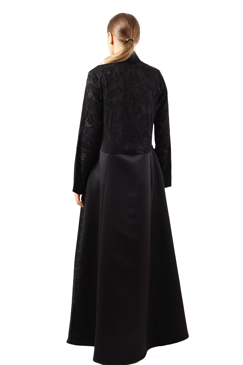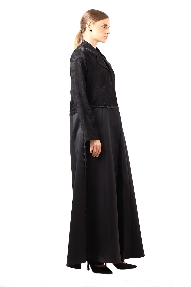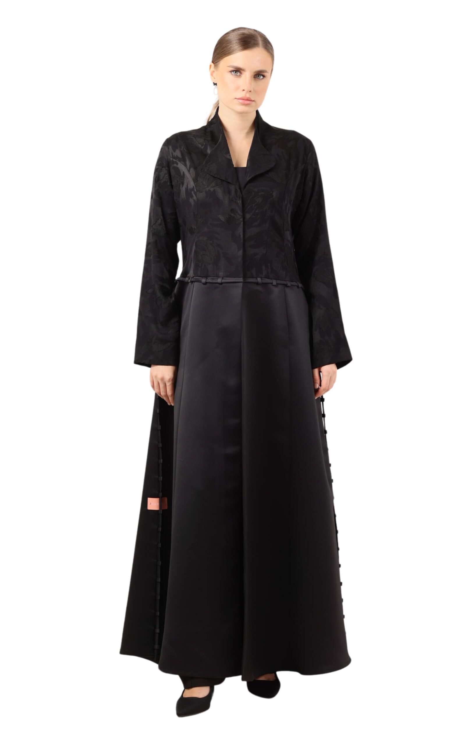 Celia is a chic abaya with a structured collar, a flattering silhouette, and a graceful blend of fluidity and form, exuding timeless elegance.