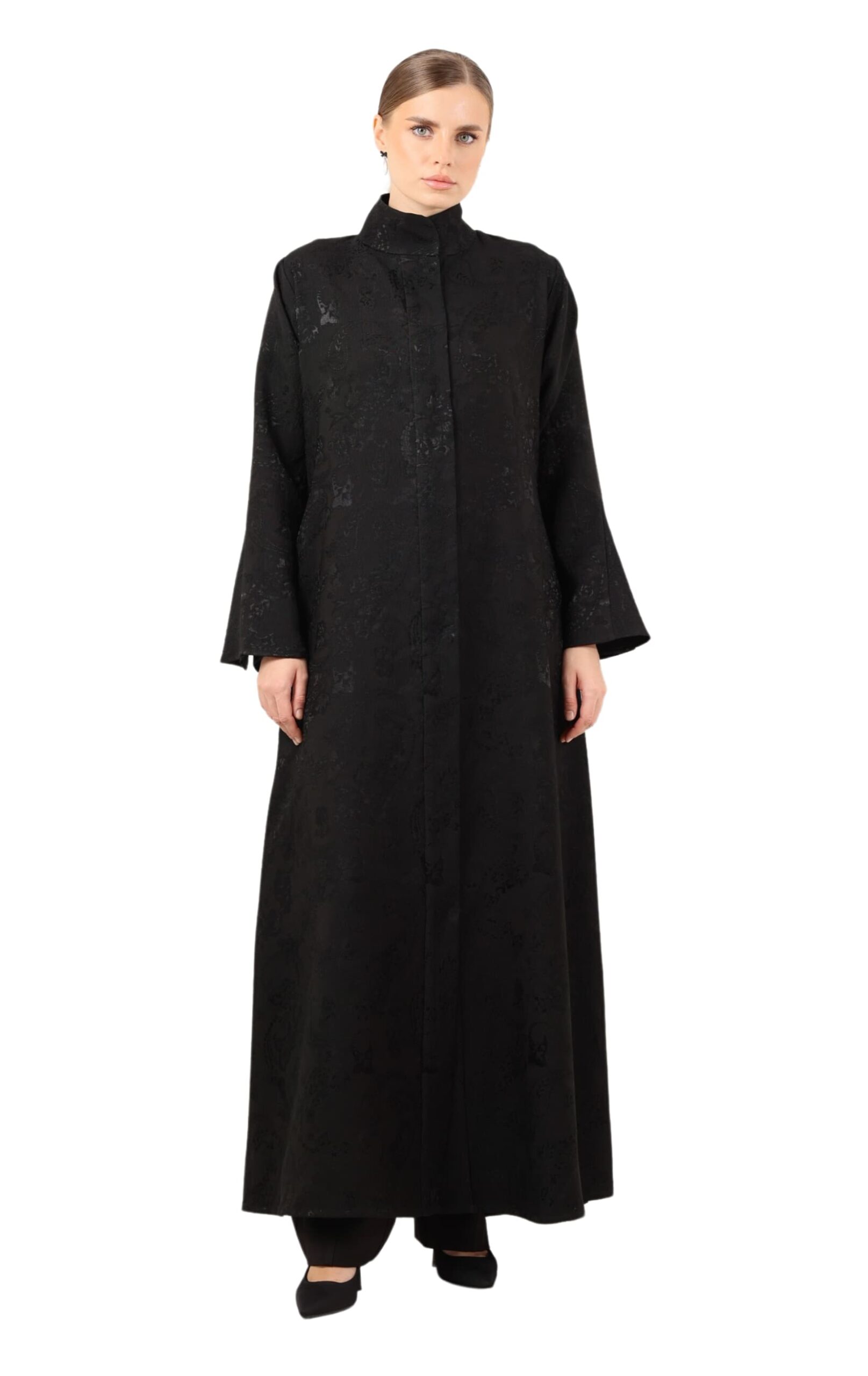Noirette is a sophisticated flared-cut abaya with flared sleeves, crafted from luxurious black textured fabric that contours the body, offering a perfect balance of elegance and subtle allure.